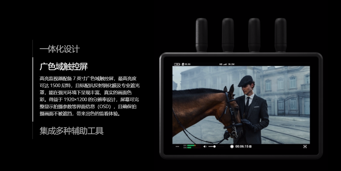 与传统图传方案不同,DJI Transmission将高亮监视器与图传接收器合二为一,监视器配备7英寸广色域触屏,最高亮度1500尼特、分辨率为1920×1200,系统内集成安全框、遮幅、斑马线、假色、峰值等辅助工具。