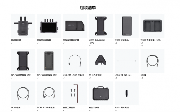 接口方面,图传发射器提供3G-SDI输入/环出接口,HDMI 1.4 Type-A 输入接口;图传监视器提供3.5毫米立体声插孔、microSD卡槽、HDMI 2.0 Type-A输入接口、电源等接口。
