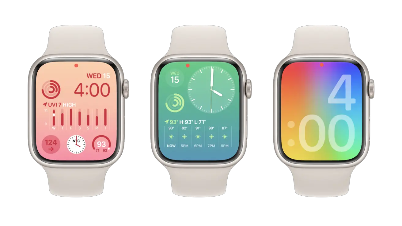 这三款表盘都获得了更新,以支持背景颜色。您可以从 Apple 继续添加的大量颜色中进行选择。除了黑色之外,还有彩虹色、纯色或渐变色。渐变看起来特别好。颜色选择是红色、三叶草、深渊蓝、橙色、星光、绿色和蓝色。这些颜色在变暗时会逐渐消失,并且会稍微着色屏幕上的图标和小部件。