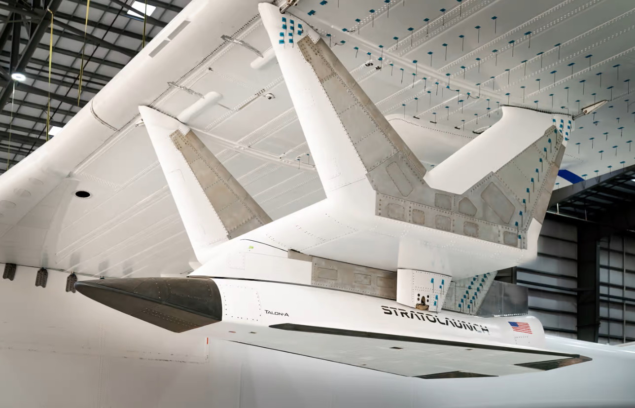 与此同时,Stratolaunch公司一直在忙于为Roc飞机安装携带Talon-A进入空中所需的挂架硬件。挂架由铝和碳纤维表皮制成,具有一个绞盘系统,可将TA-O吊装到位,重约8000磅(3629公斤),同时占据了 Roc飞机中心翼展的14英尺(4.3米)。