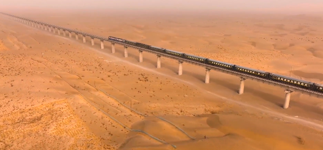 新的和若铁路与现有格库铁路、南疆铁路共同构成一条2712公里的环形铁路,“环抱”塔克拉玛干沙漠,成为了世界首个沙漠铁路环线。