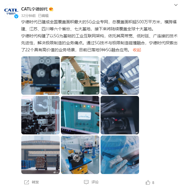 通过将5G技术应用于极限制造,宁德时代已经探索出了22个具有高价值的业务场景,且已经有9种5G融合应用实现落地。