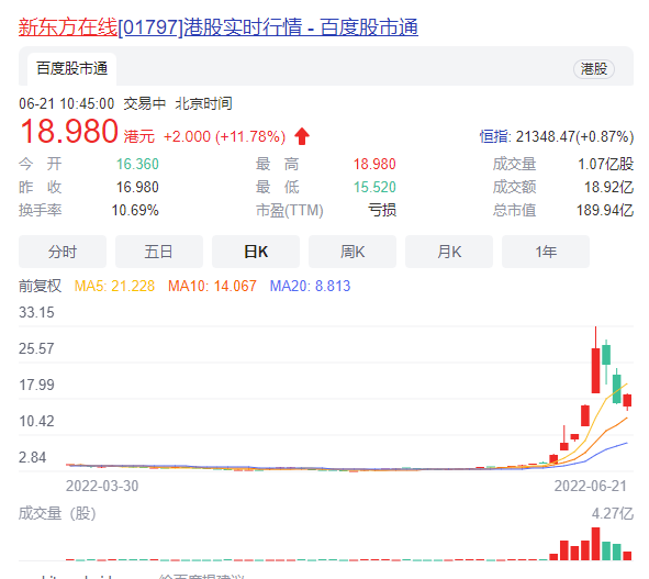 然而在该消息曝光之后,新东方在线股价就结束了连续两个交易日的回调,继续大涨,截止发稿前报价18.98港元/股。