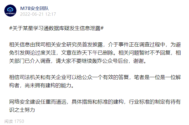 今日,M78安全团队微信号发布消息称,关于某星学习通数据库疑发生信息泄露相关信息由我司相关安全研究员首发披露,介于事件正在调查过程中,为避免引发舆论过度关注,文章在昨天下午已删除。