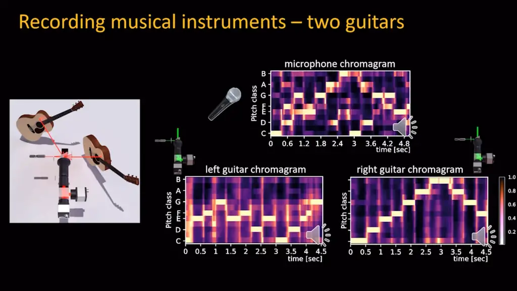 该团队已经在吉他和小提琴上、扬声器纸盆、音叉上,甚至是坐在扬声器前并随着环境声音而振动的 Doritos 包上测试了这种光学麦克风。他们还用它来分离两把吉他演奏二重奏的音频,以及两个扬声器的音频,每个扬声器都在播放不同的歌曲。