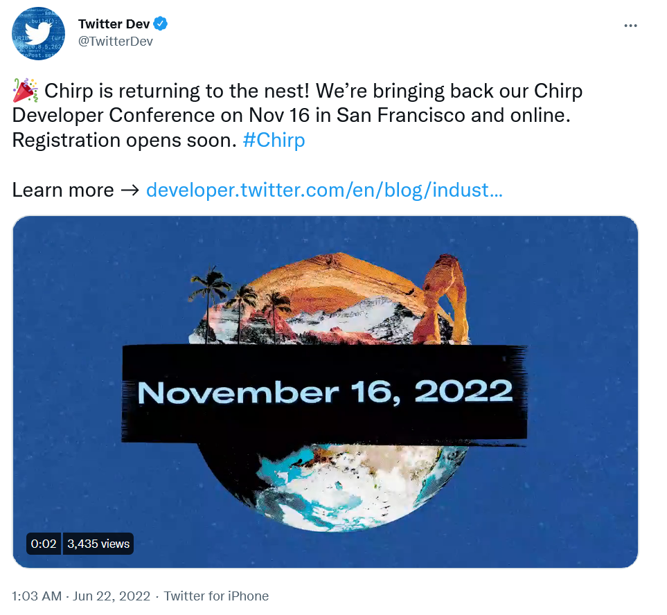 即将举行的Chirp会议将在旧金山亲自举行并将进行在线直播。注册将很快通过Twitter的开发者网站对外开放。