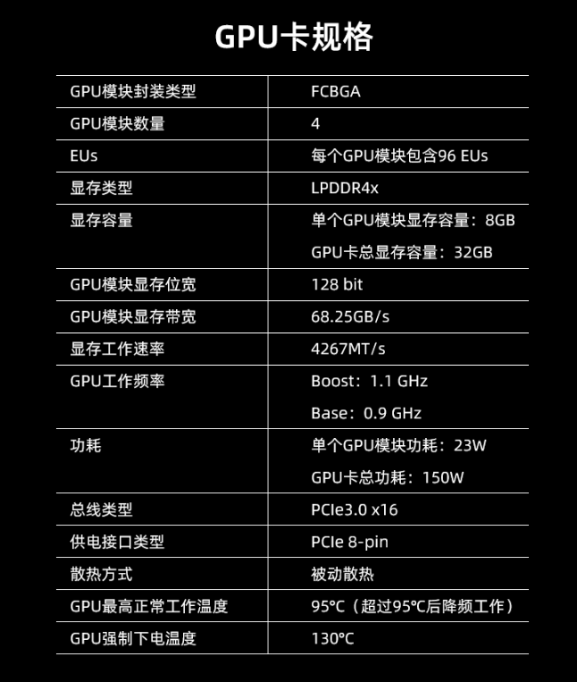 单个GPU模块功耗23W,整卡功耗150W,单个8针辅助供电。