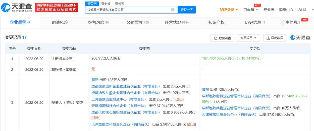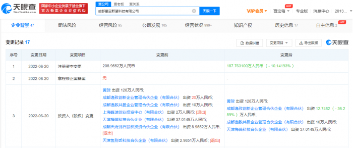 天眼查App显示,近日,交个朋友母公司成都星空野望科技有限公司发生工商变更,上海峰瑞创业投资中心(有限合伙)、成都天府浅石股权投资合伙企业(有限合伙)、天津鱼别丢科技合伙企业(有限合伙)退出原股东行列,同时该公司注册资本减至约187.76万人民币。