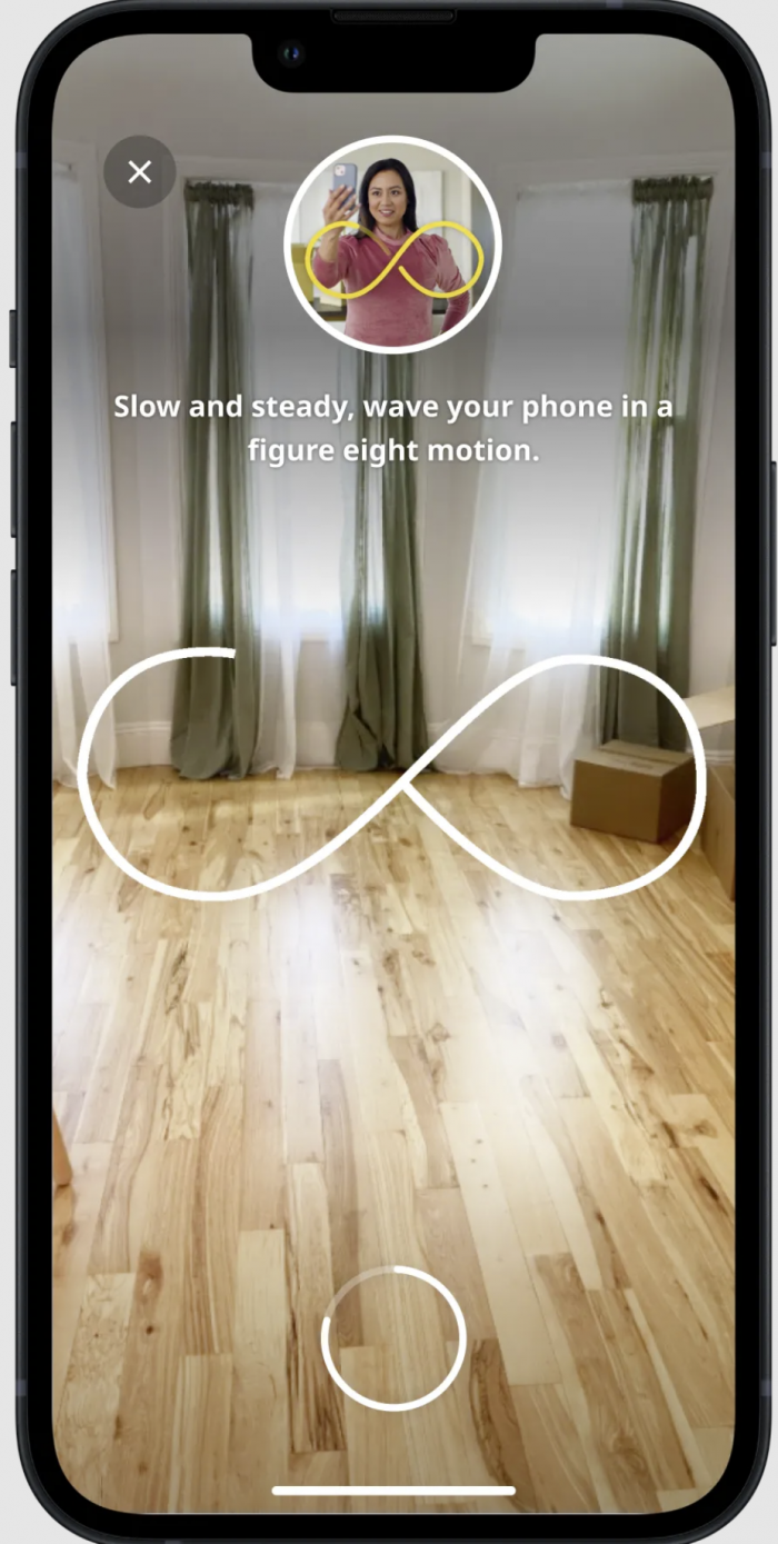 宜家Kreativ Scene Scanner从一个略显繁琐的扫描过程开始。你拍摄一系列房间的照片,构建一个全景照片,然后以八字形运动挥动你的手机,捕捉更多视觉数据。这个过程目前只适用于iPhone,但Android版本计划在今年夏天发布。一旦扫描完成,你就会得到一张图片,可以直接在应用程序上进行调整。