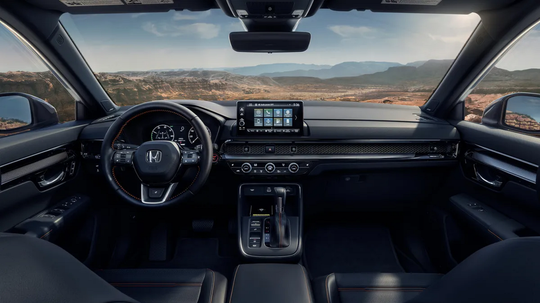 2023款CR-V的内饰大量借鉴了思域的设计,思域也为HR-V的仪表板提供了许多设计元素。思域的水平气候通风网在CR-V上看起来或多或少没有变化,甚至包括调整通风口位置的旋钮。方向盘和仪表组则看起来几乎一样,并且“浮动”的信息娱乐屏幕也回来了,其从仪表盘的中间升起。