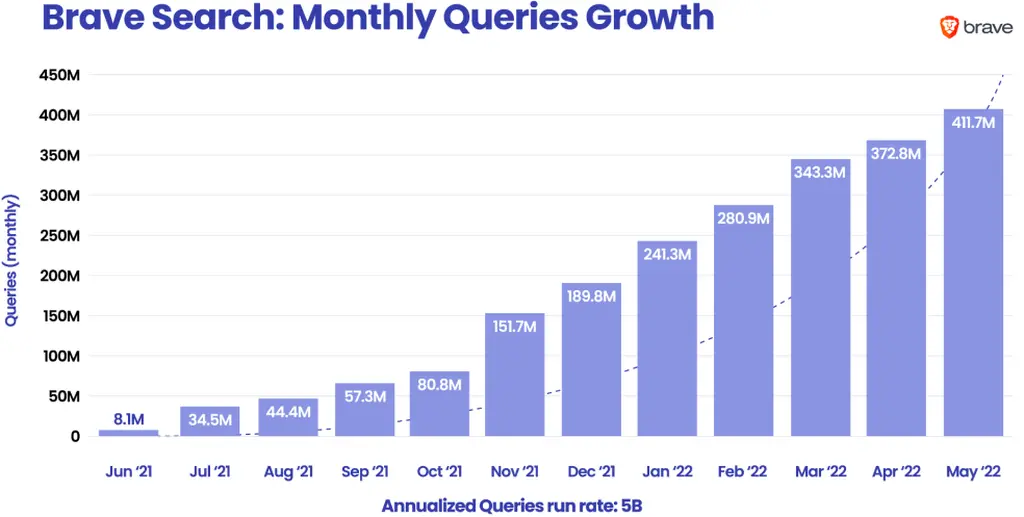 自 2021 年 6 月推出以来,Brave Search 增长了近 5,000%,从 2021 年 6 月的 810 万次搜索查询开始,到 2022 年 5 月底增长到 4.117 亿次。Brave 表示,其当前查询量的增长速度是 DuckDuckGo 的四倍,这可能得益于其庞大的 Brave 浏览器用户社区。