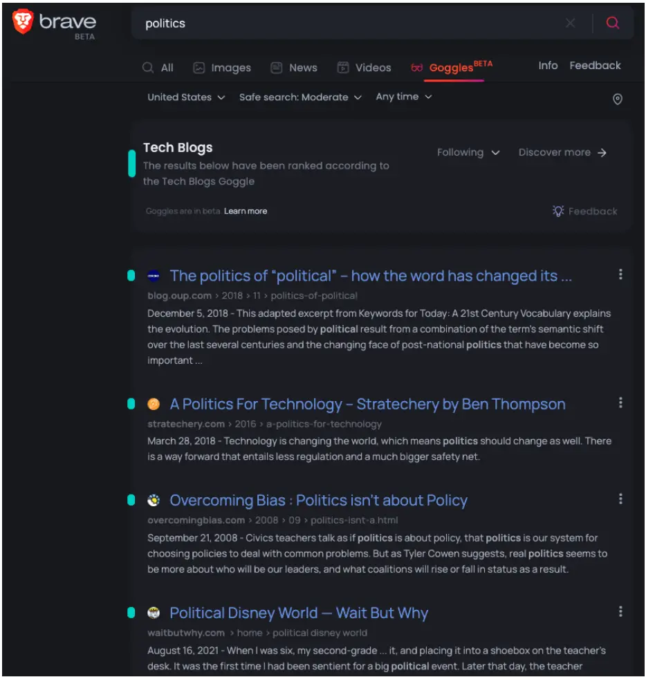 例如,用户可能更喜欢来自小型新闻博客而不是大型媒体渠道的结果,因此他们可以为其创建一个 Goggle 并让这些结果排名更高,而不是查看多个搜索结果页面。