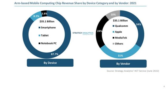 2021年,智能手机、平板电脑和笔记本电脑处理器分别占基于Arm的移动计算芯片总营收的88%、9%和3%。