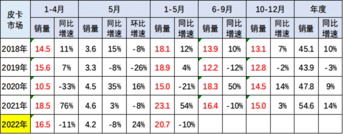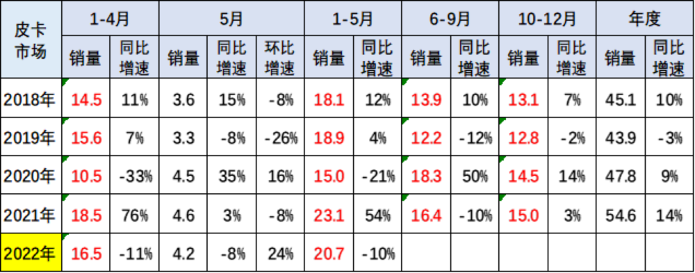 今年前 5 个月,皮卡在中国卖掉了 20.7 万台,存在感没有刷起来。要知道,这还是在国家政策大力做推手的时代语境下。