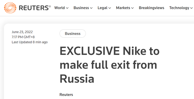 美国知名运动品牌“耐克”当天在一份电子邮件声明中称,在俄业务暂停三个月后,该品牌将全面退出俄罗斯市场。之前,美国星巴克公司宣布将退出俄罗斯市场。星巴克当天在给员工们的备忘录中表示,决定关闭其在俄罗斯的130家门店,其品牌在俄罗斯市场上也将不再保留。