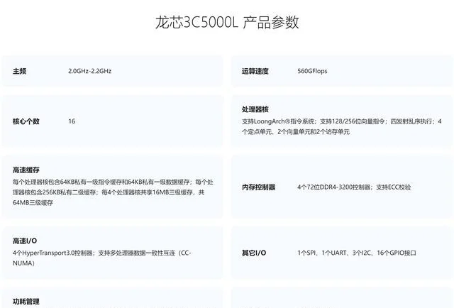 具体参数方面,3C5000L的主频为2.0GHz-2.2GHz,支持4个72位DDR4-3200控制器,支持ECC校验,支持1个SPI、1个UART、3个I2C、16个GPIO接口,功耗为130W。