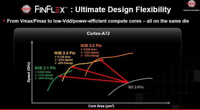 • N3E 添加了“FinFLEX”方法选项,三个不同的单元库针对不同的 PPA 要求进行了优化