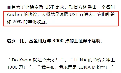 当时为了让稳定币 UST 更火,Luna 的项目方整了名叫 Anchor 的协议,把 UST 存进去,它们大概能给你 20% 的年化收益。