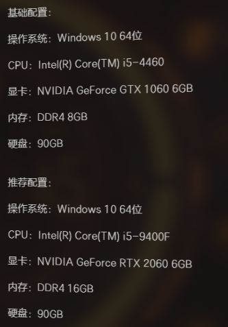 而想要达到最好的画面效果,则需要一颗Intel i5-9400F处理器,以及一张NVIDIA RTX 2060 6GB显卡,以及16GB DDR4内存,以及90GB硬盘空间。