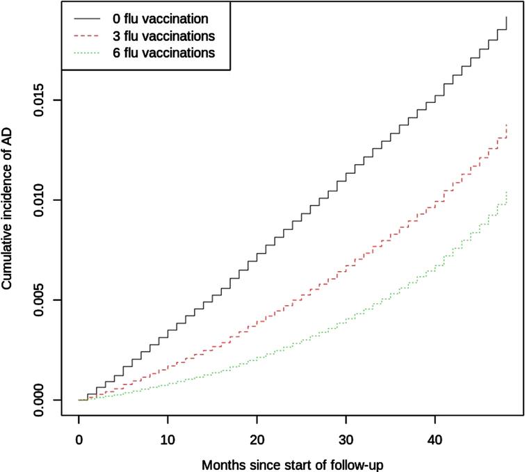 在大约六年的时间里,研究人员看到5.1%的接种过流感疫苗的受试者患上了阿尔茨海默病,而在未接种疫苗的群体中,有8.5%的人患上了这种疾病。研究人员计算出,65岁以上的受试者每年接受流感疫苗接种至少4年,阿尔茨海默病的风险减少40%。