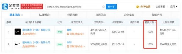 企查查APP显示,由NIKE China Holding HK Limited全资控股的耐克体育(中国)有限公司与耐克商业(中国)有限公司在中国大陆共注册有328家分支机构,目前已注销107家。