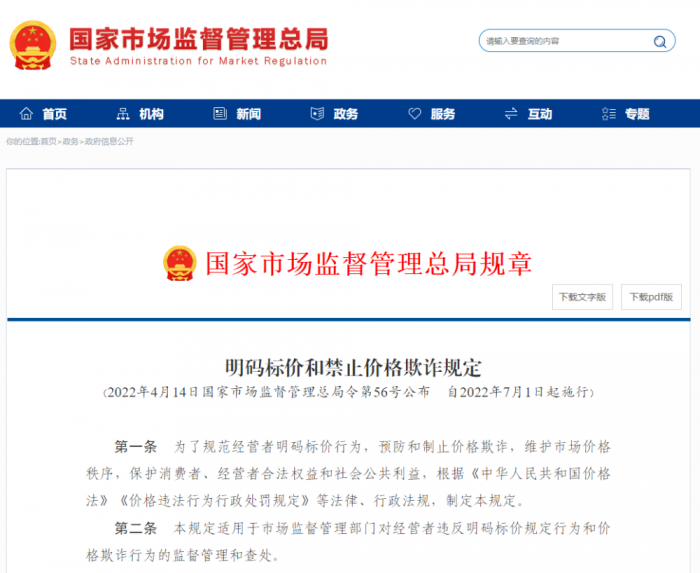 市场监管总局发布的《明码标价和禁止价格欺诈规定》7月1日起施行。《规定》明确了经营者不得实施的七种典型价格欺诈行为,包括谎称商品和服务价格为政府定价或者政府指导价;