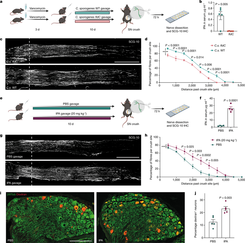 为了确认IPA是否导致了神经修复,小鼠被用抗生素处理以清除它们内脏中的任何细菌。然后给它们提供可以或不可以产生IPA的基因修饰的梭状芽孢杆菌菌株。