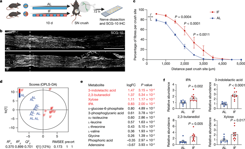 科学家们还研究了禁食如何导致这种神经再生。他们发现,在限制饮食的小鼠血液中,包括IPA在内的特定代谢物的水平明显更高。