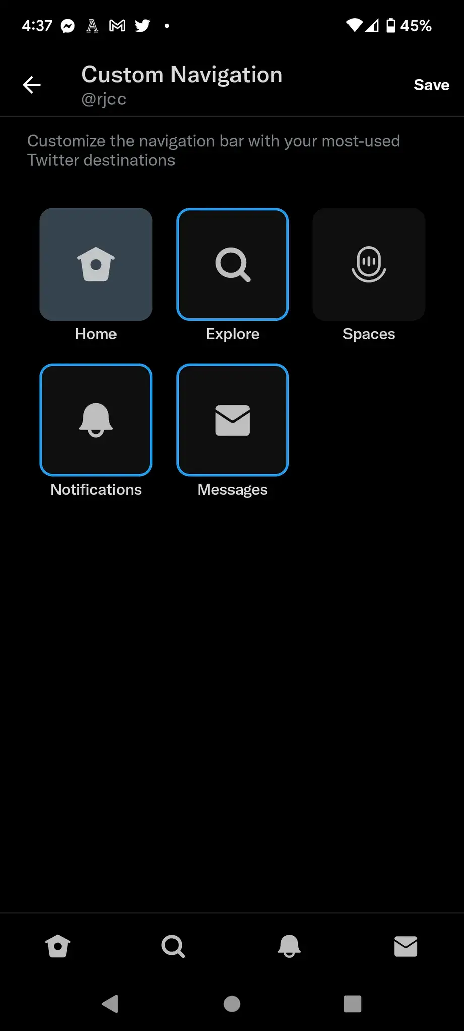 Twitter Blue 终于允许 Android 端订阅用户自定义应用的导航条。该功能此前仅向 iOS 用户开放,允许用户摆脱导航栏中间的 Spaces 图标。通过自定义导航,用户可以最少将显示的选项卡数量减少到 2 个。