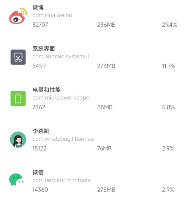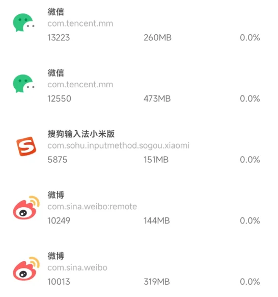 没开墓碑机制前,我在手机后台开着微信、微博、百度地图、微信读书等 App,各位差友可以看到它们即使在后台,也依旧占用着一部分 CPU 资源: