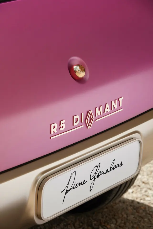 雷诺5 Diamant的车身则从5的原始形式中平滑下来,另外还搭配了“宝石般”的头灯和尾灯及三层油漆。后者由涂在粉红色基底上的金色颜料组成并覆盖有哑光清漆。这种安排带来了在阳光下看到金色闪光、在较暗条件下看到蓝色色调的视觉效果。