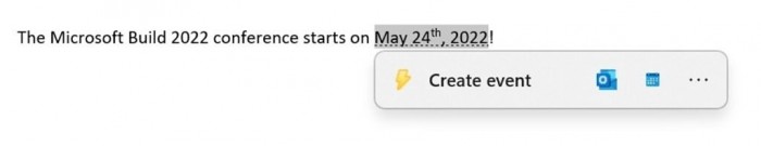 在22622.290中,Windows 11加入了选中文本的操作建议,当用户选中日期等信息时,Windows 11将会自动提出创建事件等建议。