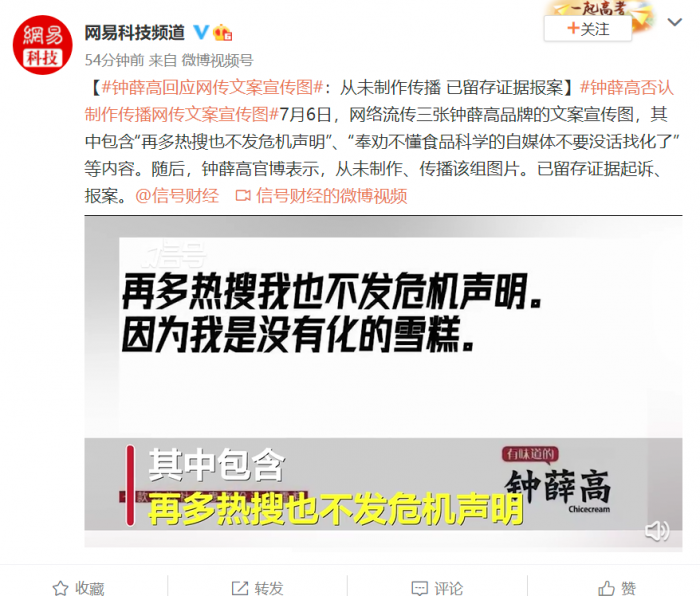 最近钟薛高因为雪糕价格高、少不化等问题引发网络热议,多次上头条,同时网上还传出了一些文案称“再多热搜也不发危机声明”,钟薛高官方对此表示否认。钟薛高就网传文案宣传图发布回应称:从未制作、传播该组图片。已留存证据起诉、报案。保留通过法律手段对不实诽谤谣言追究责任的权利。