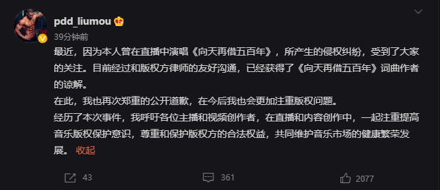 前段时间,知名主播PDD因直播演唱《向天再借五百年》被相关方起诉索赔,引起网友们的热议。PDD今日通过微博表示经过和版权方律师的友好沟通,已经获得了该歌曲词曲作者的谅解。PDD也再次郑重的公开道歉,表示今后将更重视版权问题,维护音乐市场的健康繁荣发展。