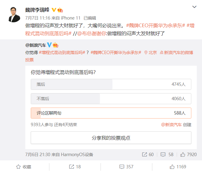 一石激起千层浪。华为余承东对增程式的高度赞赏,引发了魏牌CEO李瑞峰的强烈反对,直接开怼:“增程式混动技术落后是行业共识,再大的嘴,也不能大放厥词。”近日,李瑞峰接连发布微博,强调“增程式就是落后的”“做增程的闷声发大财就好了”“增程式拿落后的技术割韭菜”等观点。
