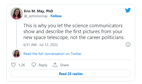 拜登随后交给了美国宇航局局长比尔·纳尔逊,他做了一个简短的演讲,持续了不到三分钟。整个新闻发布会最多11分钟就结束了。有些人说,这是因为简报会要继续讨论明天发布的图片,但是......这不是人们得到的事件的借口。