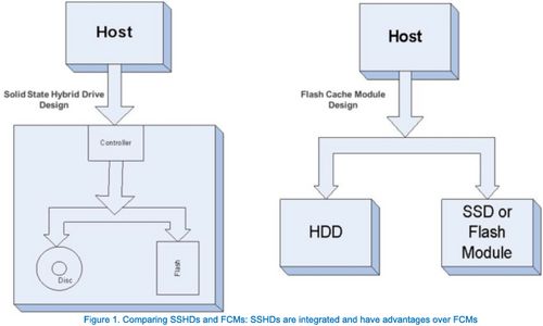 固态硬盘可以简单理解为NAND FLASH颗粒+机械硬盘的混合体,看起来有点类似大容量缓存的机械硬盘,但运行机制方面却完全不同。硬盘芯片采用的是DDR DRAM芯片,容量从几MB到几百MB,主要为机械硬盘提供数据缓冲的作用;而混合硬盘中的NAND FLASH颗粒容量通常为几GB到几十GB,主要是利用其高速度存取的优势来改善机械硬盘的平均存取时间,而存储的主体依然是高容量的机械硬盘部分,有点类似于Windows Vista和Windows 7中的“Ready Boost”机制。