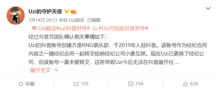现在Uzi已更换了经纪公司,但该账号一直未被转交,这将导致Uzi今后无法在抖音展开任何活动和合作。
