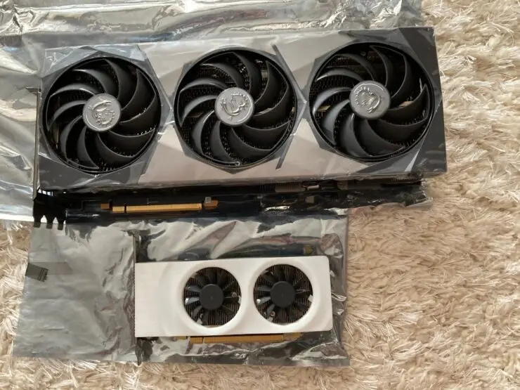 这款显卡采用半长(不超过 167.65mm)和半高(不超过 68.9mm)设计。该显卡采用 Single Slot 规范,在 GPU、VRM 和 VRAM 上有铝合金散热片阵列,并通过 11 个扇叶的 2 个标准风扇进行散热。图片中作为对比的是微星 GeForce RTX 3090 Ti SUPRIM X 显卡,显然块头大了很多。
