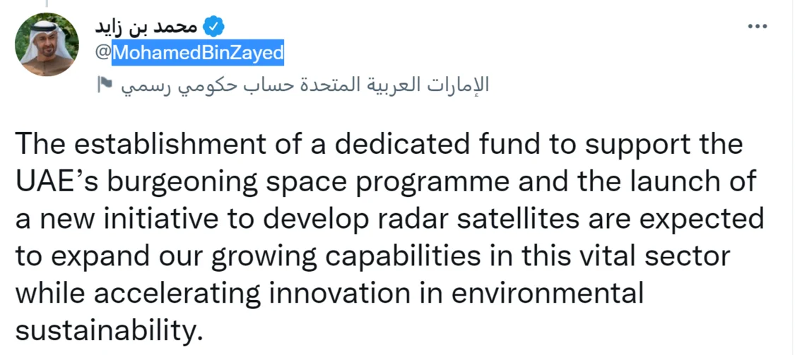 阿联酋新总统Mohamed bin Zayed在个人社交媒体推特上发文称, “将成立专项基金来支持阿联酋蓬勃发展的太空项目,并启动一项开发雷达卫星的新举措,预计将继续扩大我们在这一关键领域的能力,同时加快环境可持续性创新。”