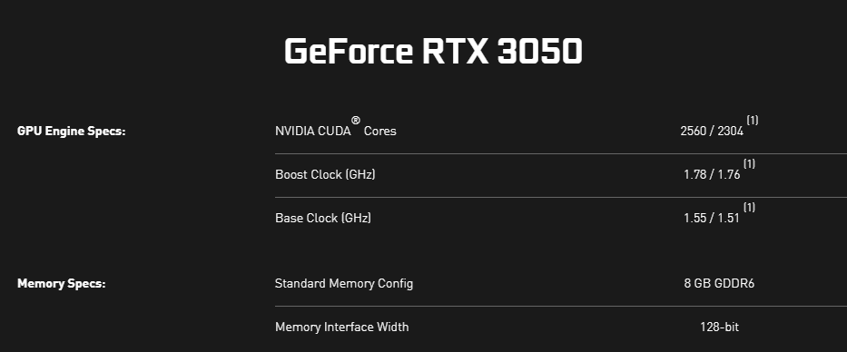 有趣的是,查询NVIDIA官方网站发现,RTX 3050其实已经悄悄列出了这个OEM版本,确实是2304个CUDA核心,同时核心基准频率从1.55GHz降低到1.51GHz,最高加速频率从1.78GHz降低到1.76GHz。