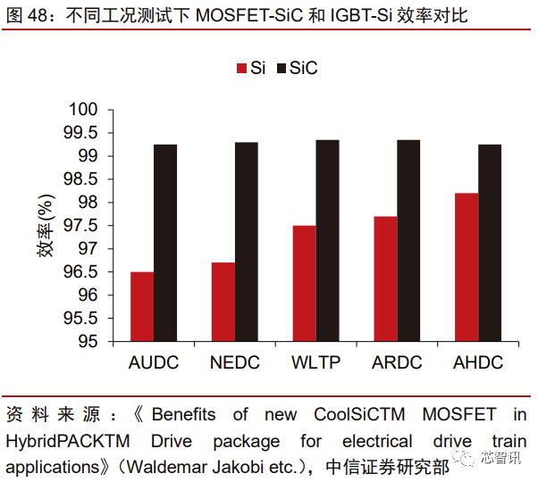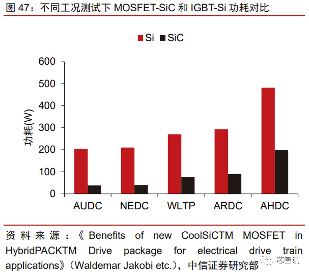 相比 IGBT,SiC 能够带动多个性能全面提升,优势显著。由于 Si-IGBT 和 Si-FRD 组成的 IGBT 模块在追求低损耗的道路上走到极致,意法半导体、英飞凌等功率器件厂商 纷纷开始研发 SiC 技术。与 Si 基材料相比,SiC 器件的优势集中体现在:1)SiC 带隙宽, 工作结温在 200℃以上,耐压可达 20kV;2)SiC 器件体积可以减少至 IGBT 的 1/3~1/5, 重量减少至 40%~60%;3)功耗降低 60%~80%,效率提升 1%~3%,续航提升约 10%。在多项工况测试下,SiC MOSFET 相比 Si-IGBT 在功耗和效率上优势显著。