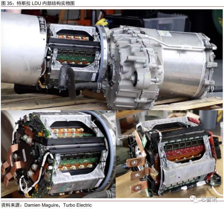 而 SDU 的形态更小,内部结构也更为紧凑,内部逆变器含 36 个 IGBT。根据 01芯闻拆解,SDU 中的 IGBT 为单管 IGBT,型号为英飞凌的 AUIRGPS4067D1,总用量为 36 片。IGBT 单管的布局也有较大变化,IGBT 单管背靠背固定在散热器中,组成类似三明治的结构,充分利用内部空间。同时,SDU 内部 IGBT 的管脚也无需折弯,降低失效概率。相比 LDU,SDU 的出现体现出特斯拉对 IGBT 更高的关注度与要求,其机械、电学、成 本、空间等指标均有明显提升。