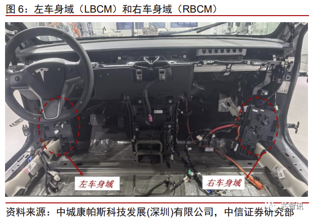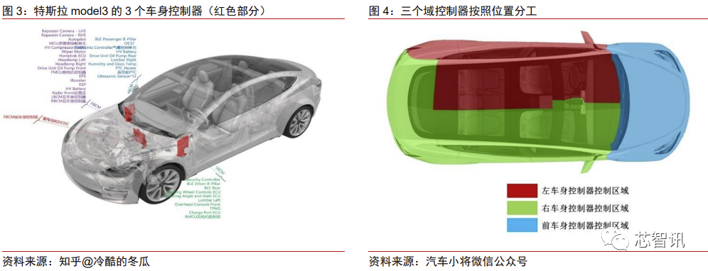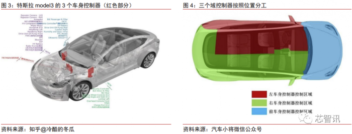 与博世形成对比,特斯拉 model 3 在 2016 年发布,2017 年量产上市,与博世的报告 几乎处于同一时期。然而,Model 3 的域控制器架构核心直接从功能变成了位置,3 个车 身控制器就集中体现了特斯拉造车的新思路。按照特斯拉的思路,每个控制器应该负责控 制其附近的元器件,而非整车中的所有同类元器件,这样才能最大化减少车身布线复杂度, 充分发挥当今芯片的通用性和高性能,降低汽车开发和制造成本。所以特斯拉的三个车身 域控制器分别分布在前车身、左前门和右前门前,实现就近控制。