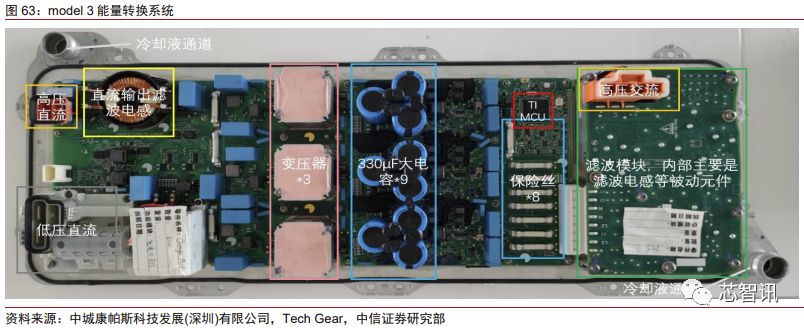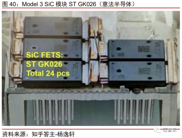 Model 3 所用的 SiC 型号为意法半导体的 ST GK026。在相同功率等级下,这款 SiC 模块采用激光焊接将 SiC MOSFET、输入母排和输出三相铜进行连接,封装尺寸也明显小 于硅模块,并且开关损耗降低 75%。采用 SiC 模块替代 IGBT 模块,其系统效率可以提高 5%左右,芯片数量及总面积也均有所减少。如果仍采用 Model X 的 IGBT,则需要 54-60 颗 IGBT。
