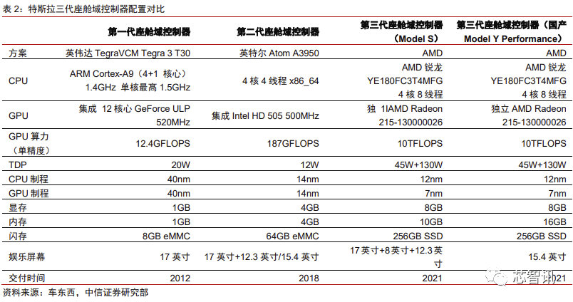 但特斯拉作为一家重视车辆智能水平的企业,并不会坐视落后的局面一直保持下去。2021 年发布的所有新款车型都换装 AMD CPU(zen+架构)和独立显卡(RDNA2 架构), GPU 算力提升超过 50 倍,存储也从 eMMC 换成了 SSD,读写性能和寿命都得到大幅改 善。整体来看,相比 MCU2,MCU3 性能获得明显提升,提升幅度比第一代到第二代的跨度更大。