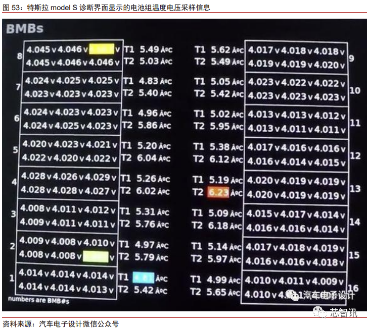 由于特斯拉一直采用数量庞大的小圆柱电池来构造电池组,导致其 BMS 系统的复杂 度较高。在 model S 时代,特斯拉全车使用了 7104 节电池,BMS 对其进行控制是需要一 定软件水平的。根据汽车电子工程师叶磊的表述,在 model S 当中,采用每 74 节电池并 联检测一次电压,每 444 节电池设置 2 个温度探测点。从汽车电子工程师朱玉龙发布的 model S 诊断界面图也可以看出,整个电池组共有 16*6=96 个电压采样点,以及 32 个温 度采样点。可以看到采样的数据是很多的,需要管理的电池数量也为其增加了难度,最终 BMS 将依据这些数据设置合理的控制策略。高复杂度的电池组也让特斯拉在 BMS 领域积 累了相当强的实力。与之相对,其他厂商的 BMS 复杂度就远不如特斯拉高,例如大众 MEB 平台的首款电动车 ID.3 采用最多 12 个电池组模块,其电池管理算法相对会比较简单。
