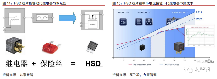 配电功能方面,一方面需要实时监测各部件中电流的大小,另一方面也需要根据监测 的结果对电流通断和电流大小进行控制。电流监测方面,AMS 的双 ADC 数据采集芯片和 电流传感器配套芯片(黄色框 AMS 中的芯片)可以起到重要作用。而要控制电流的状态, 一方面是通过 MOSFET 的开关,另一方面也可以通过 HSD 芯片(High Side Driver,高 边开关),这种芯片可以控制从电源正极流出的电流通断。