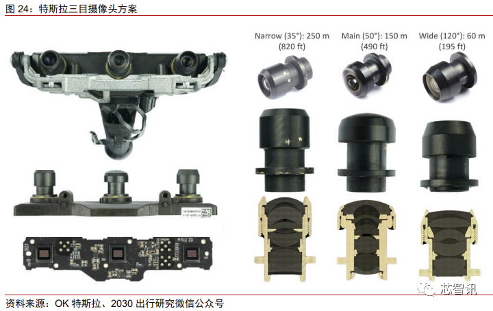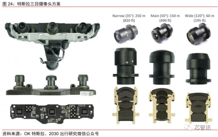 其最核心的前视三目摄像头包含中间的主摄像头以及两侧的长焦镜头和广角镜头,形 成不同视野范围的搭配,三个摄像头用的是相同的安森美图像传感器。