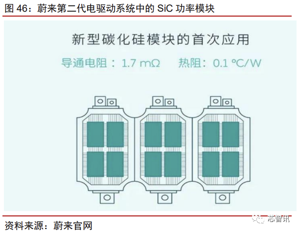 Model 3 为第一款采用全 SiC 功率模块电机控制器的纯电动汽车,开创 SiC 应用的先 河。基于 IGBT 的诸多优势,在 Model 3 问世之前,世面上的新能源车均采用 IGBT 方案。而 Model 3 利用 SiC 模块替换 IGBT 模块,这一里程碑式的创新大大加速了 SiC 等宽禁带 半导体在汽车领域的推广与应用。根据 SystemPlus consulting 拆解报告,Model 3 的主逆 变器上共有 24 个 SiC 模块,每个模块包含 2 颗 SiC 裸晶(Die),共 48 颗 SiC MOSFET。